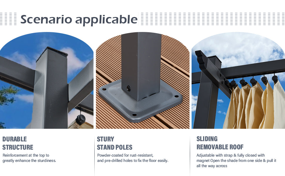 - Accessories: With our accessories package, our metal pergola is suitable for different outdoor space. it can be built on cement, grass, or concrete.